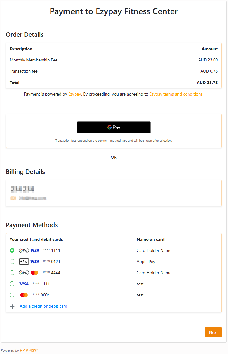 Payment data added to the checkout page is stored in Ezypay's system and available for future use. Use payment_method_linked webhook to obtain the newly added payment method.
