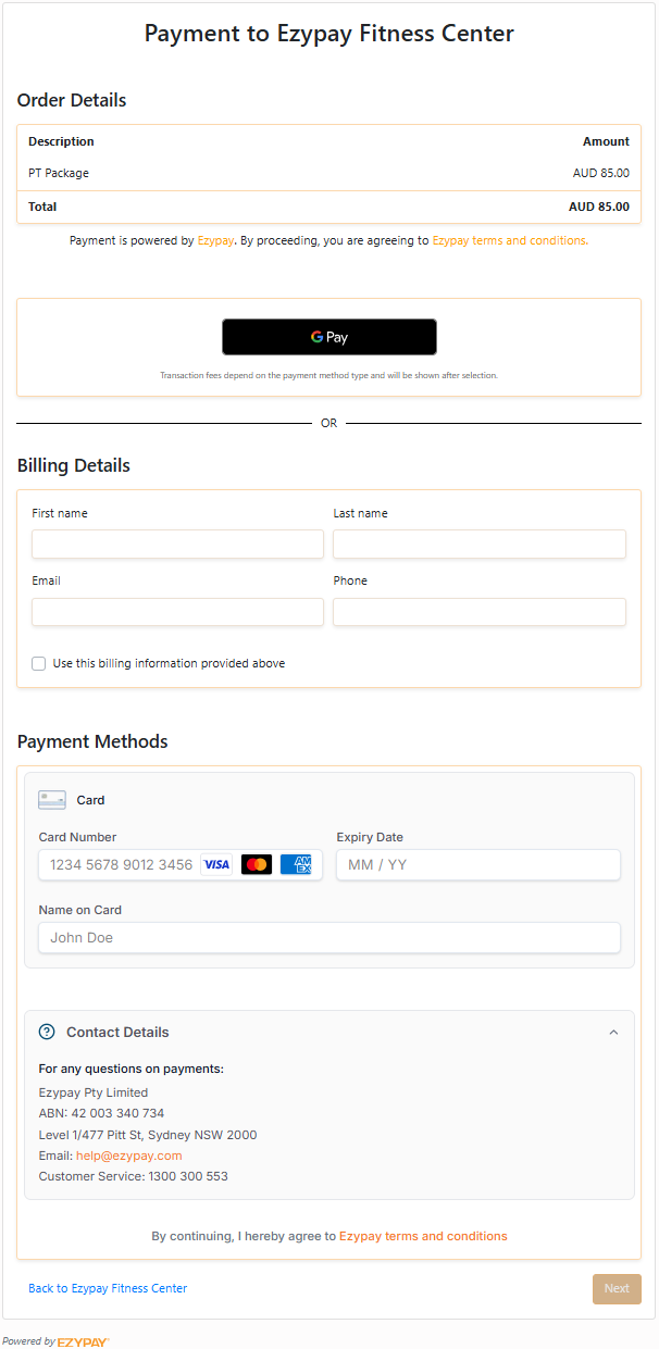 Step 1a. When no customerId is provided, customers are prompted to enter their billing details and payment method. (Figure 1). If customerId is provided, please go to step 1b. The customer must agree to Ezypay's Terms and Conditions before proceeding.