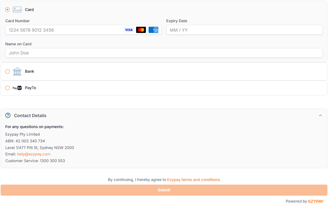 Payment capture page is used for all payment methods supported by Ezypay unless specified otherwise. It greatly simplifies integrators' efforts as they're only required to develop one solution for all Ezypay-supported payment methods.