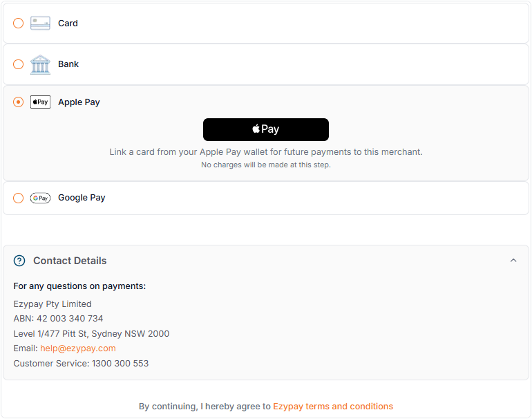 You may notice that no amount is shown in the Apple Pay payment sheet. This is expected behavior. At this stage, the flow is only linking the payment method for the recurring payments, and no charge is made during this step.